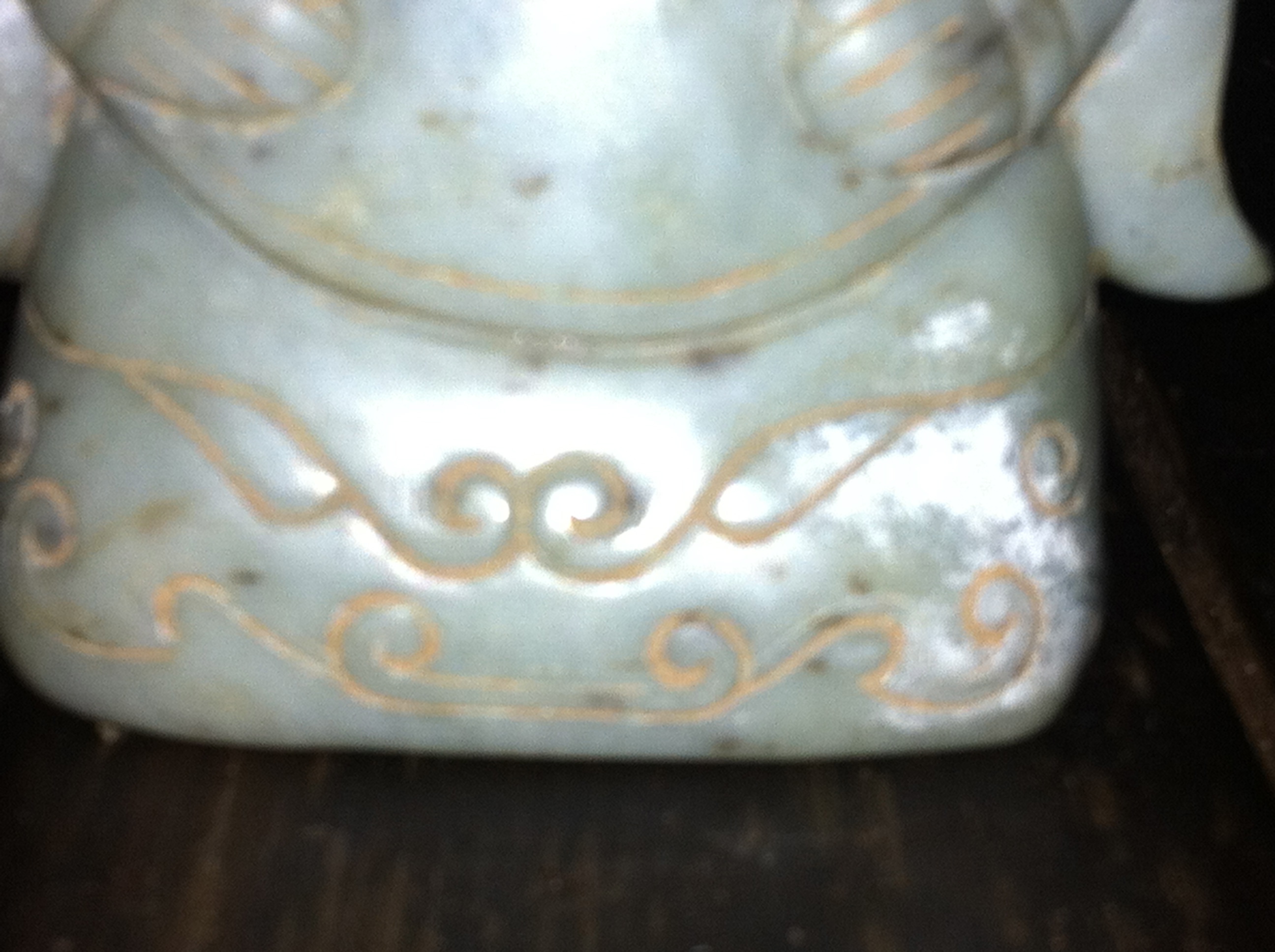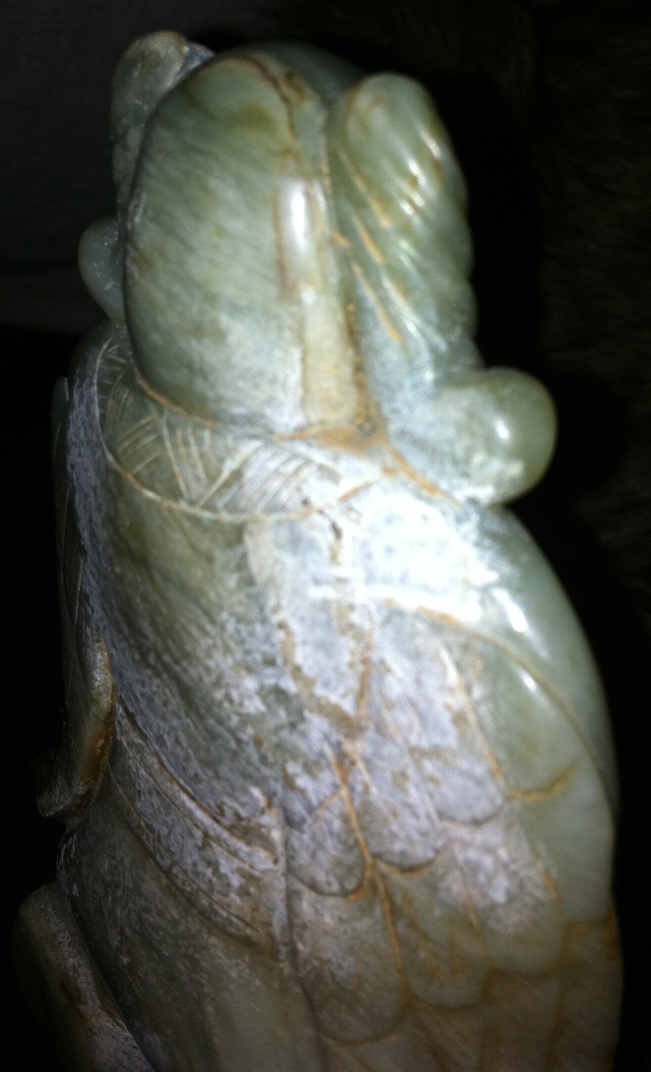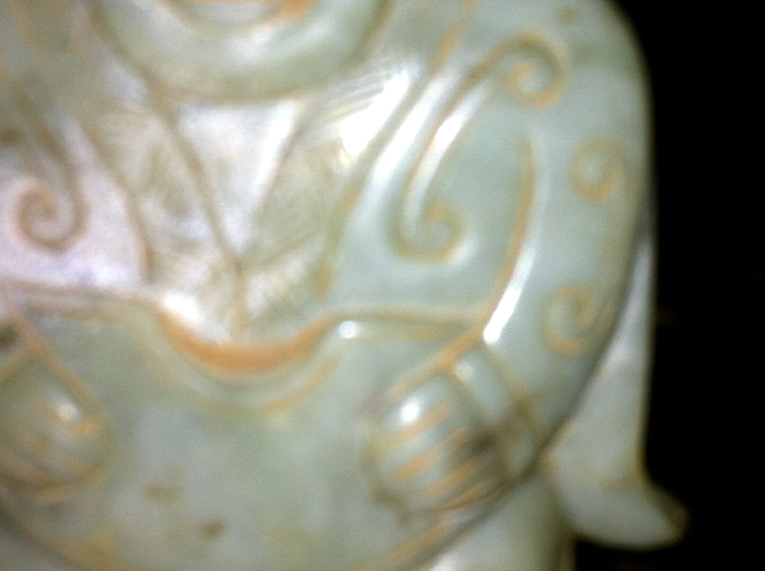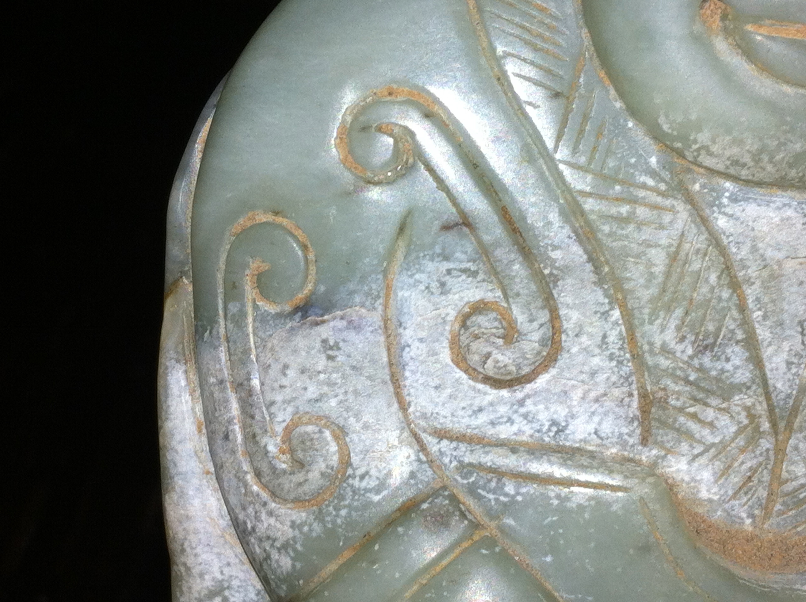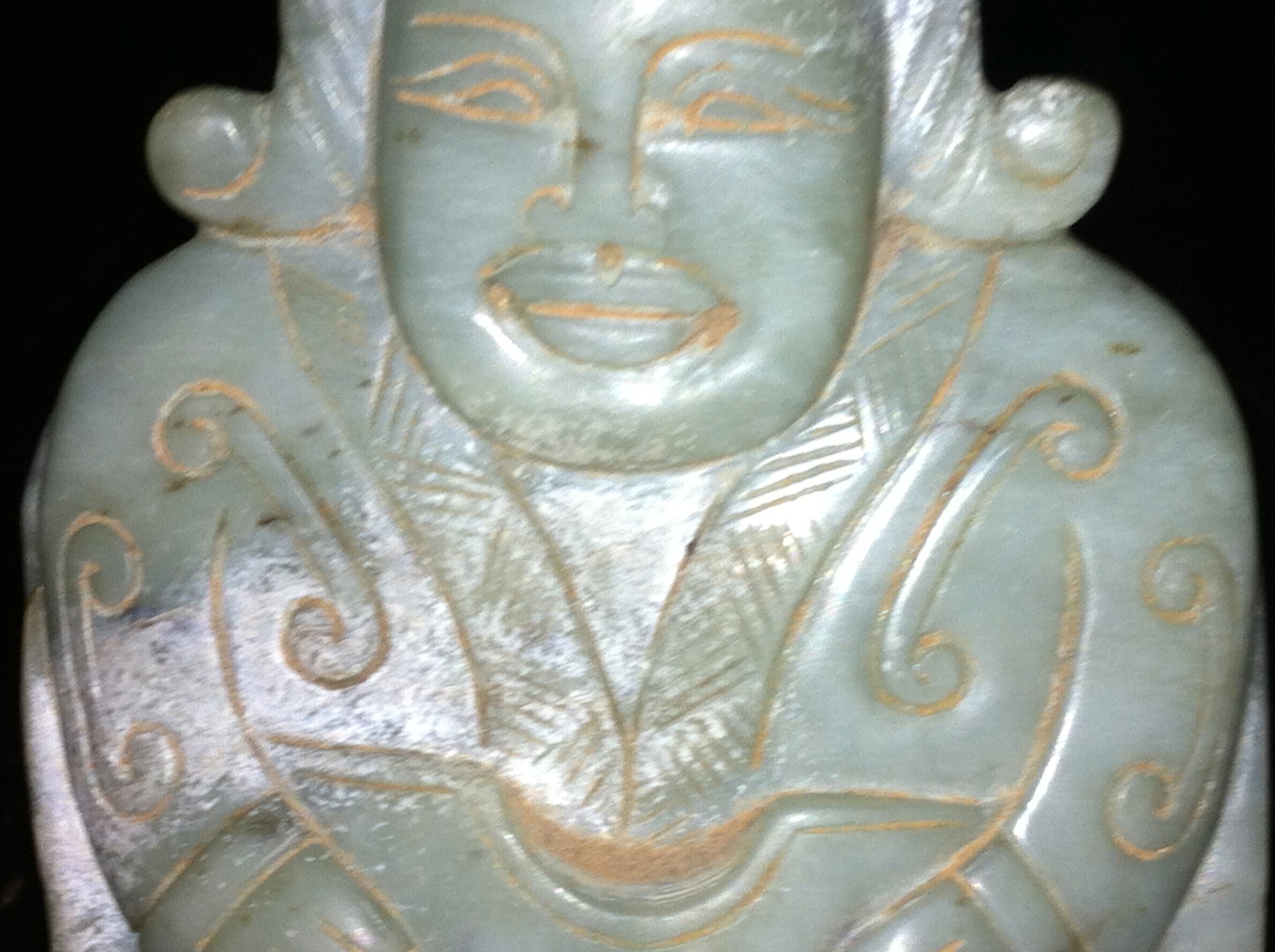 ‘Dat is Han dynastie, het is een halve Bi van Jade. Hij komt uit een serie van vier oorspronkelijk. Er staat een kosmisch symbool op.’ Ik pak het onderwerp van gesprek uit de vensterbank. Het voelt koel in mijn hand.