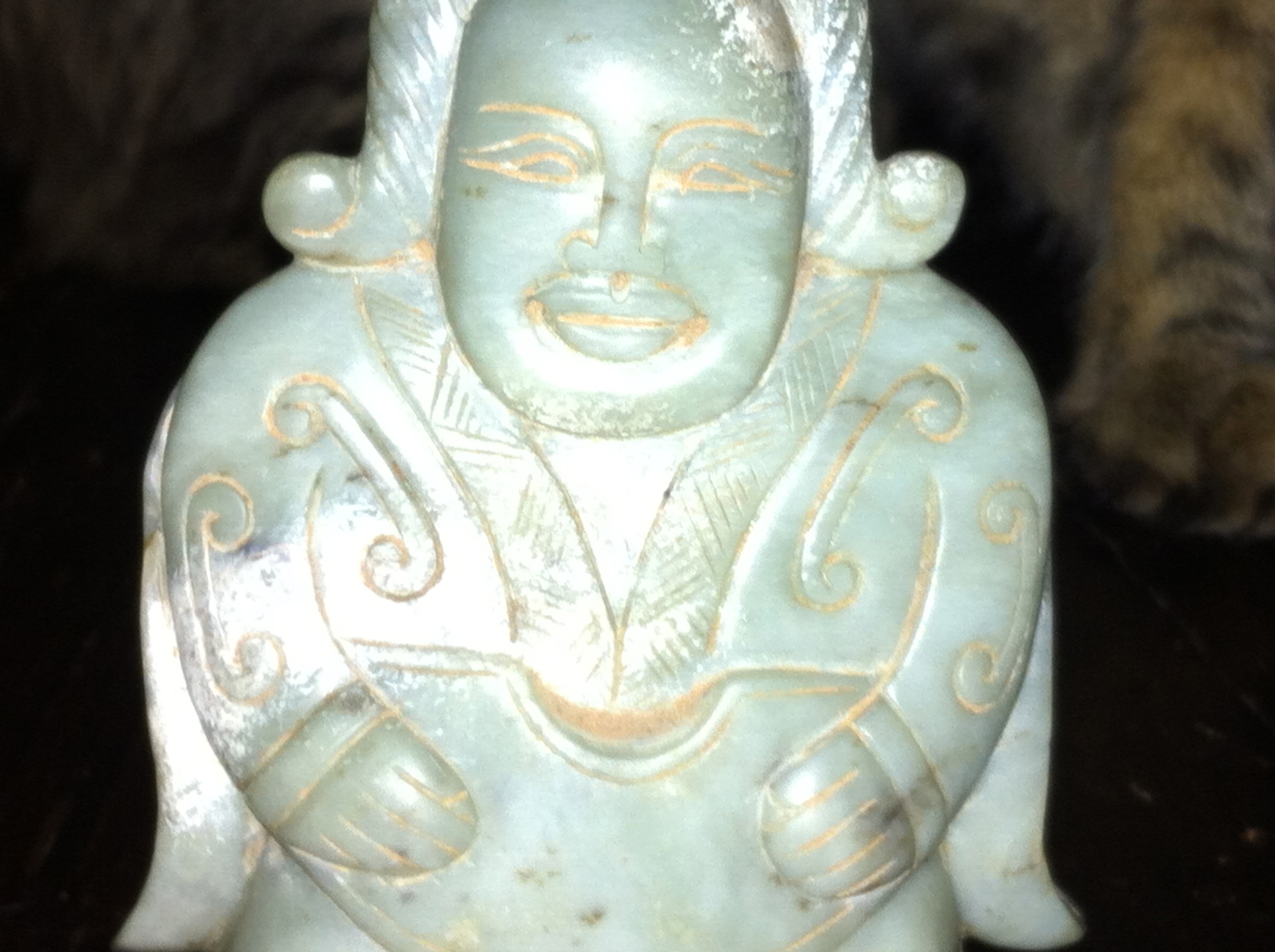 Ik ook. Wat een lieverd is het toch. Hij had er meer voor kunnen vangen, maar ja. Deze kosmisch geladen schat van jade gunt hij me gewoon. Hij laat me een prachtig beeld zien van hemzelf. Een Chinese dame, die thee drinkt, zus zo dynasty. Ze heeft enorme hamwangen. Een schoonheidsideaal uit die tijd blijkt. ‘Ik zou het daar geweldig gedaan hebben’, roept Heks uit. Ik streel de dikke bolle toet. ‘Moet dan wel zo’n tien, twintig kilo aankomen…’