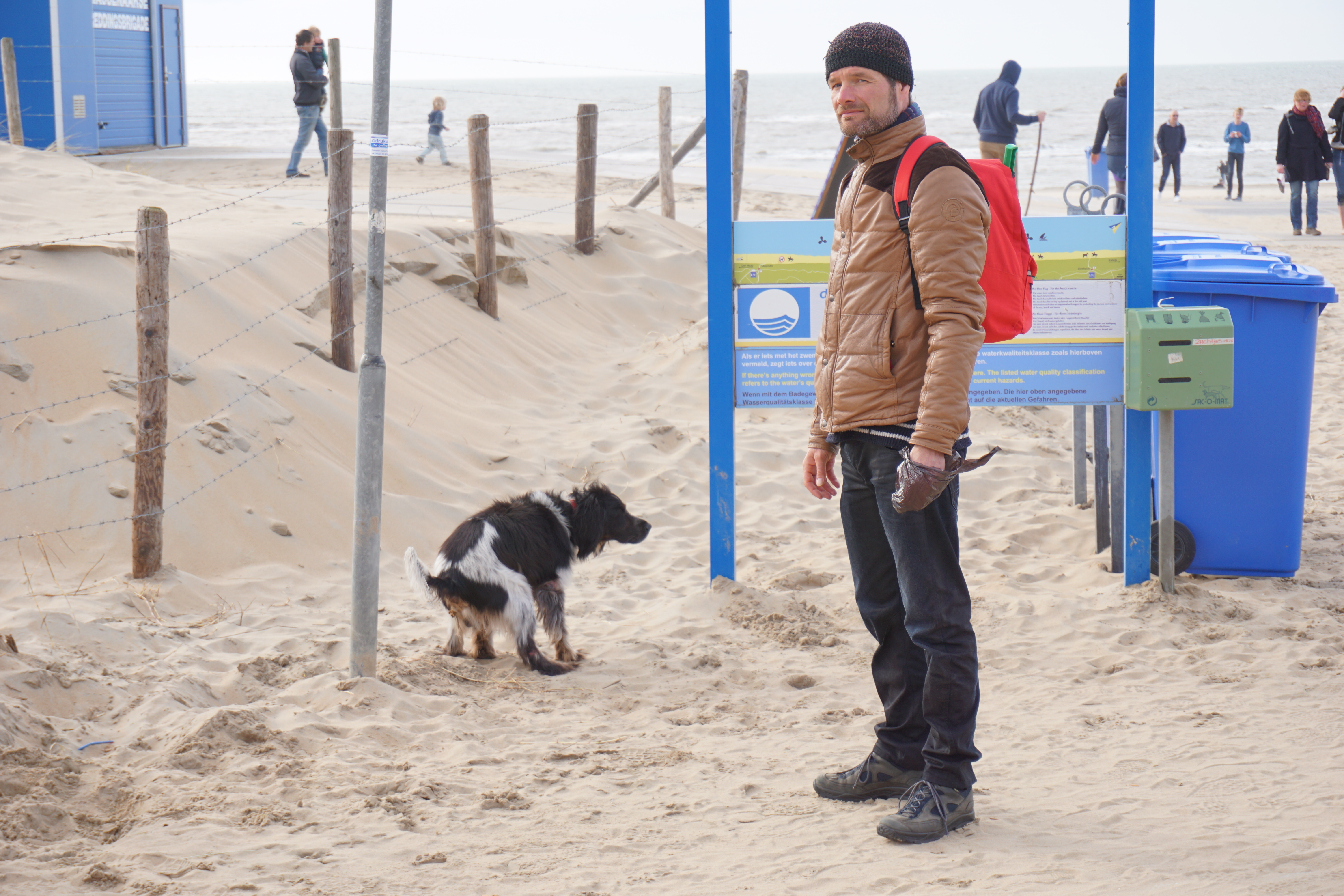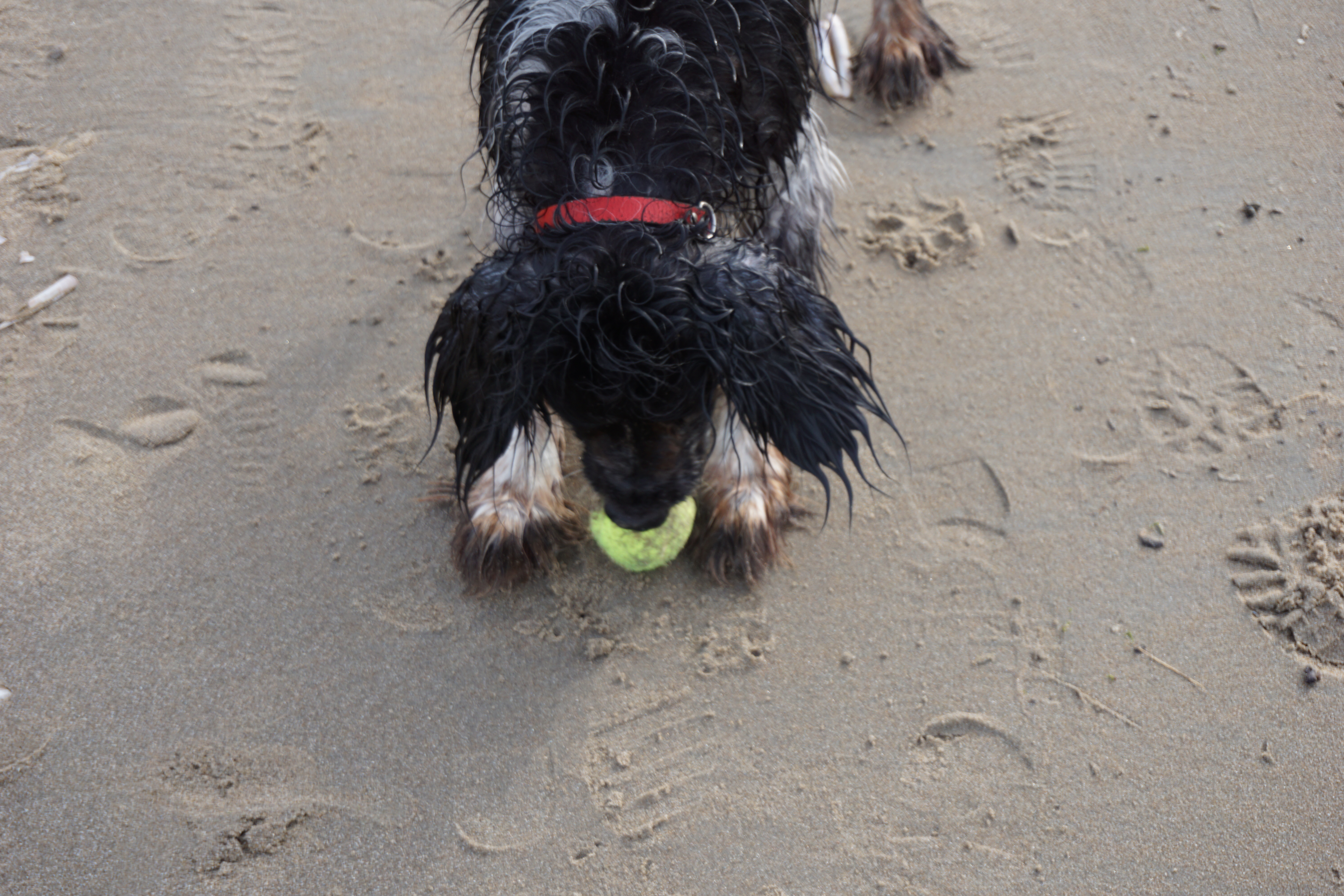 Ik verleid Varkentje met een balletje om het koude water in te gaan. Zo lekker voor zijn vacht! Fanatiek snorkelt hij door de branding op zoek naar de bal. Om vervolgens weer enthousiast met zijn prooi naar ons terug te sprinten. ‘Hij heeft het zo naar zijn zin, kijk maar naar zijn lichaamsexpressie,’ schreeuw ik tegen de wind in naar Cowboy, ‘Voor een hondje gaat er niets boven strand en zee!’