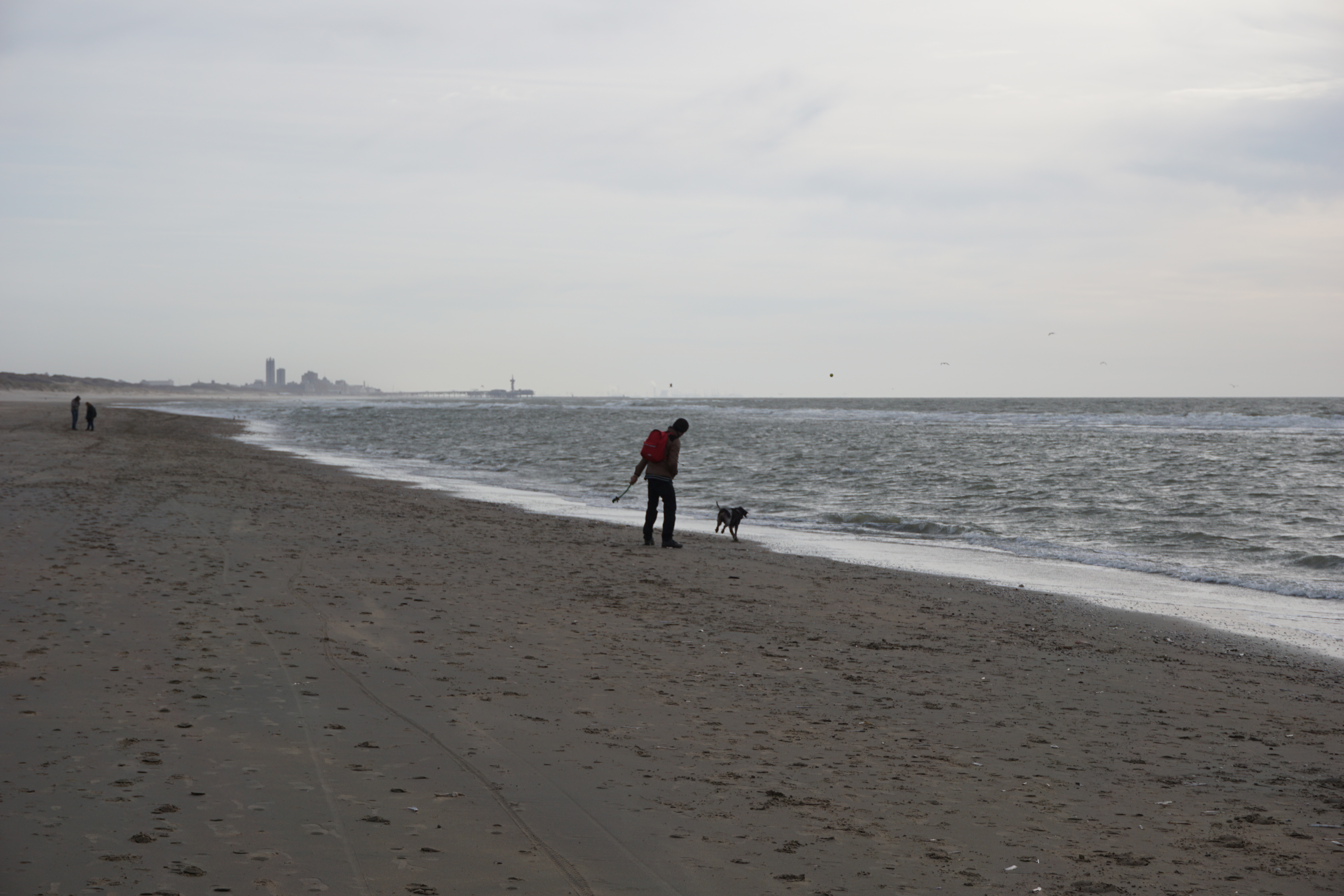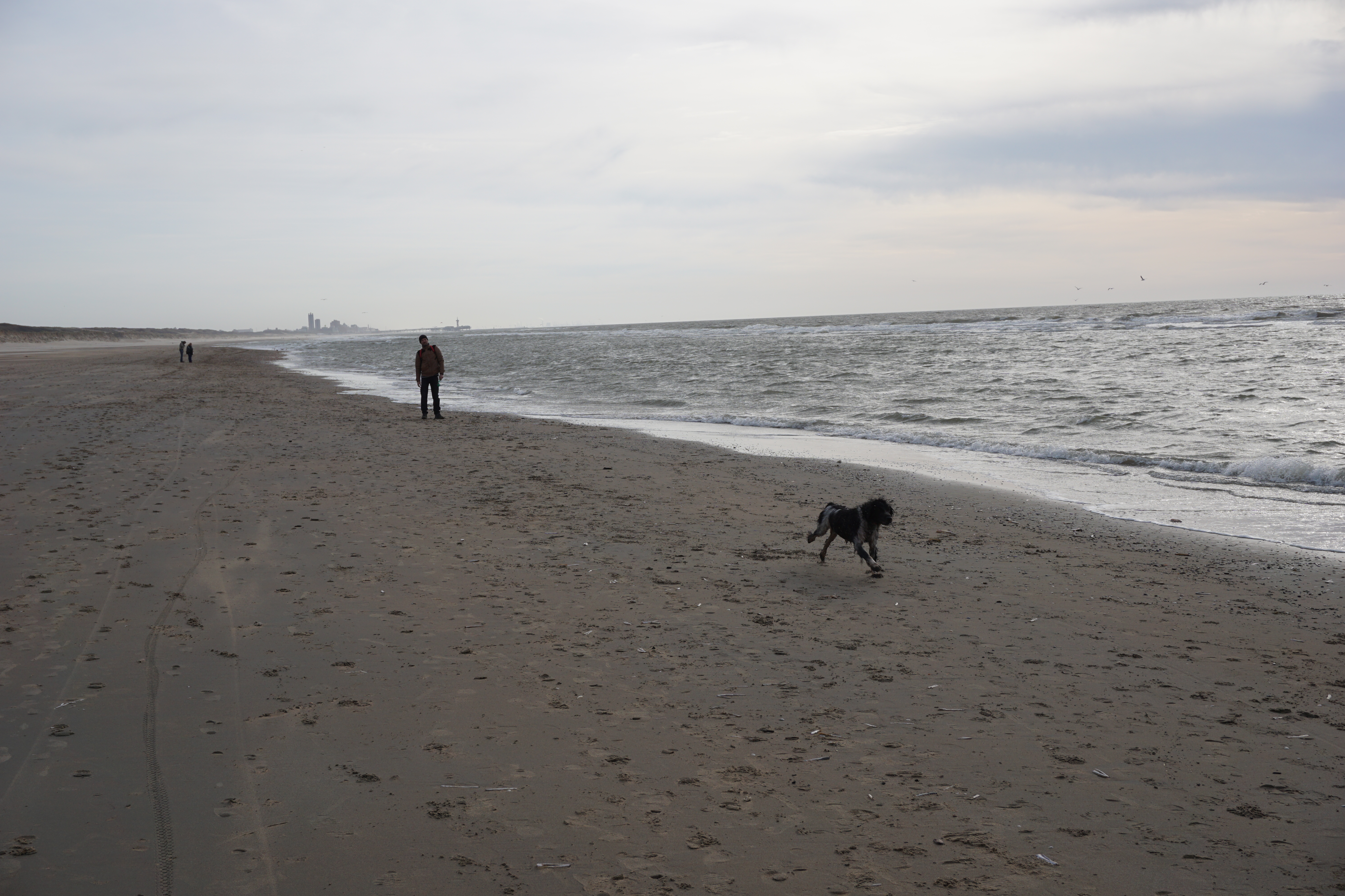 Veel komt er dus niet terecht van onze plannen in een duinpan. Behalve een plasje doen dan. Wind stuift het zand in lage striemen over het strand. Ysbrandt loopt met samengeknepen oogjes achter een balletje aan te rennen. Onze oren vullen zich met een laagje Noordzeezand. Alleen langs de vloedlijn is het een beetje te harden.