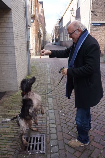 man met hond, gifbad, natte hond, bedelen om snoep