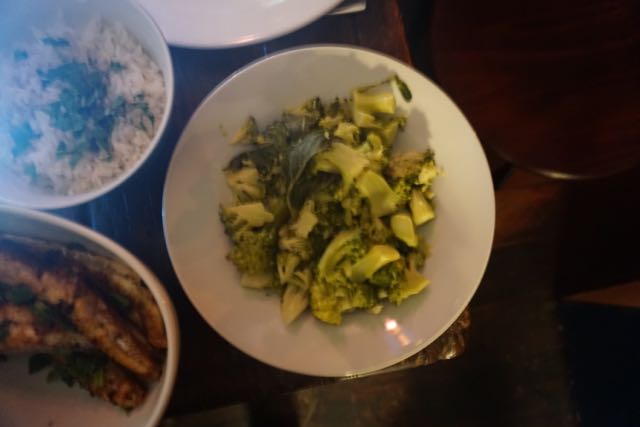 rode poon met broccoli, boontjes en rijst, tomatensalade, komkommer, munt