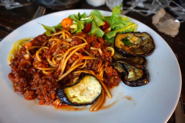 pasta met wodka, aubergine en sla