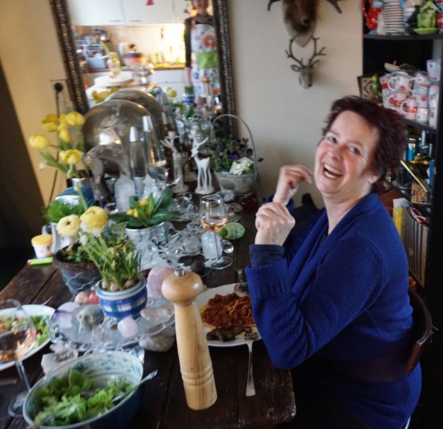 maaltijd, grote tafel feestelijk gedekt, lachende vrouw