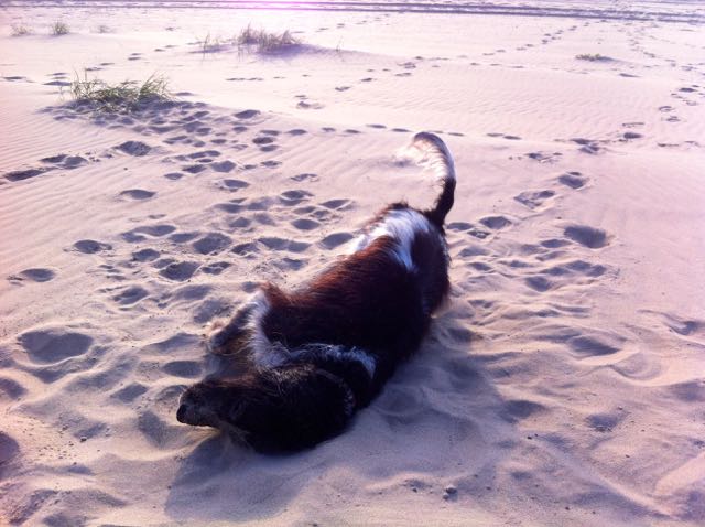 hondje op het strand, rollen in het zand, vies hondje, hond met zandkop, graven,