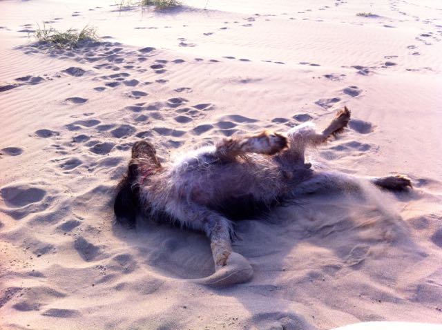 hondje op het strand, rollen in het zand, vies hondje, hond met zandkop, graven,