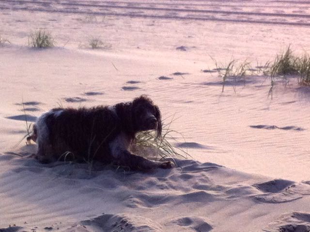 hondje op het strand, rollen in het zand, vies hondje, hond met zandkop, graven,
