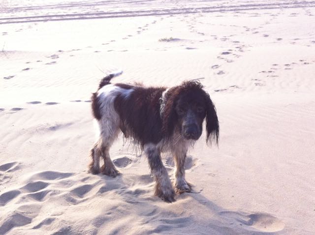 hondje op het strand, rollen in het zand, vies hondje, hond met zandkop, graven,