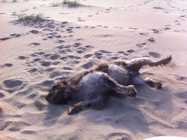 hondje op het strand, rollen in het zand, vies hondje, hond met zandkop, graven,