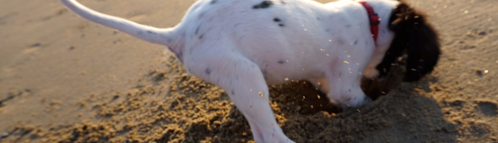 Een echtpaar komt voorbij met een paar enthousiaste volwassen Springers. Ze rennen vol overgave achter een balletje aan. Volledig gefocust. VikThor ziet het vol spanning aan. Licht trillend observeert hij zijn grote broers. ‘Wat geweldig! Stoer! Dat wil ik ook!’ zie je hem denken. Als ze weg zijn graaft hij een kuil.