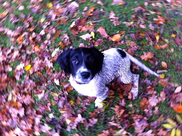 smerig hondje, Leidse Hout. hondje, Springer Spaniel puppie, zwart wit, herfstbladeren