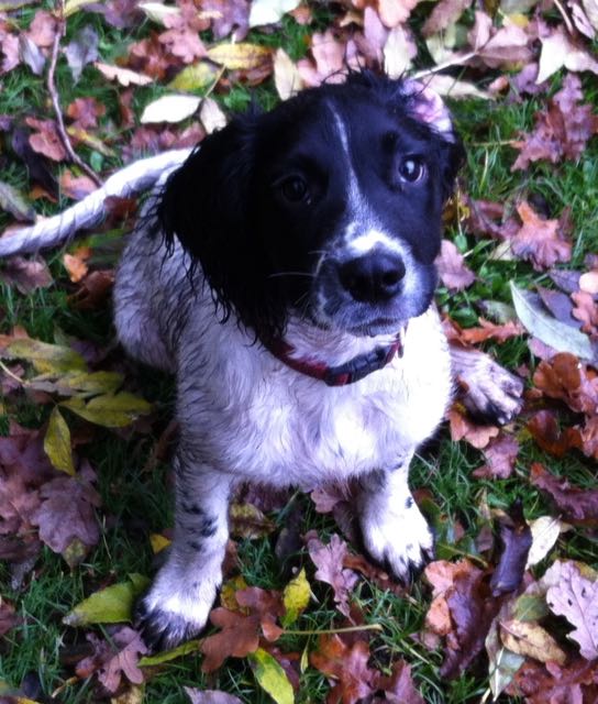 hondje, Springer Spaniel puppie, zwart wie, herfstbladeren