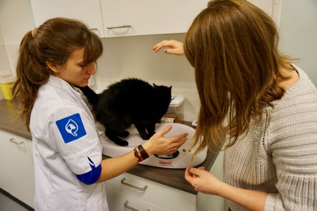 op de weegschaal bij de dierenarts, kat, lapjeskat, vaccineren, tuincentrum Ranzijn, nieuwe praktijk dierenarts,