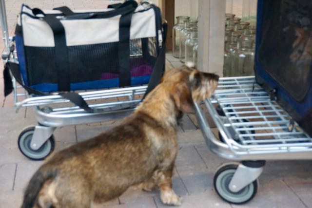 tekkel bestudeert kat, oogcontact, kat en hond staren elkaar aan,