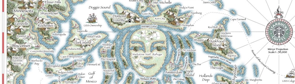 De man heeft een geweldig leuk bedrijf. Ze maken fantasielandkaarten. Associatieve cartografie. Kaarten van niet bestaande landen. Nou ja, niet bestaand…. Dat weet je maar nooit. Misschien zitten mensen wel de contouren een parallelle werkelijkheid in beeld te brengen. Wie al het zeggen?