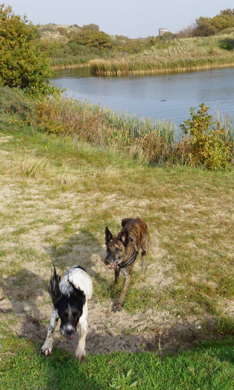 Woensdagmiddag tref ik Saar op de Cantineweg. We gaan de Coepelduynen in met onze honden. VikThor is dolblij. Hij moet het al dagen doen met afgepaste fietsrondes in de regen, dus hij heeft wel zin in een verzetje met zijn grote vriend Baris. ‘Die staat bijna te jodelen achter in de auto. Hij heeft er zo’n zin in!’