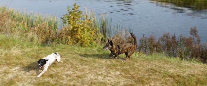 Onze viervoetige vrienden lopen weer eindeloos achter elkaar aan te rennen. Mijn kleine wendbare smurf en zijn grote kolossale vriend met zijn enorme mombakkes.