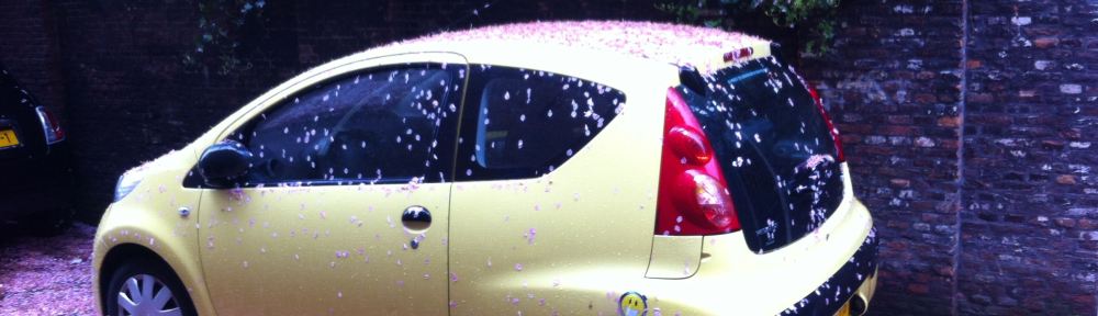 Ik veeg de ergste bloesempracht van mijn ruiten, zet de ruitenwissers even aan…. Maar dan moet ik toch echt gaan. Ik zie wel hoe het uitpakt.