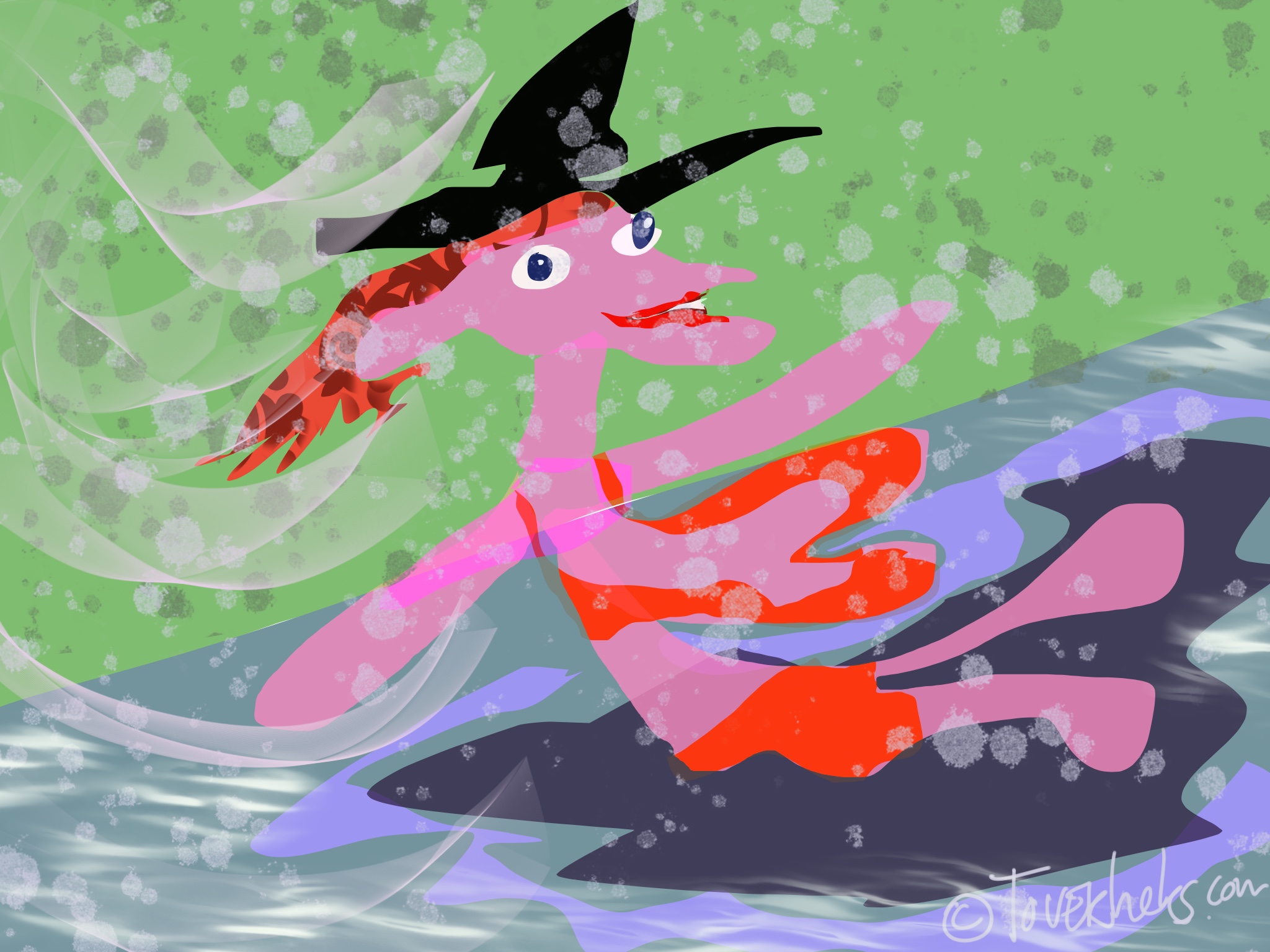 Zo snel als de wind laat ik mijn al kleding in het gras vallen. Behalve een knalrode bh en onderbroek. Die houd ik aan. De ogen van de man aan de overkant vallen bijna uit zijn hoofd. Wat gaan we nu krijgen? Een halfnaakte toverheks, die in een sloot springt?