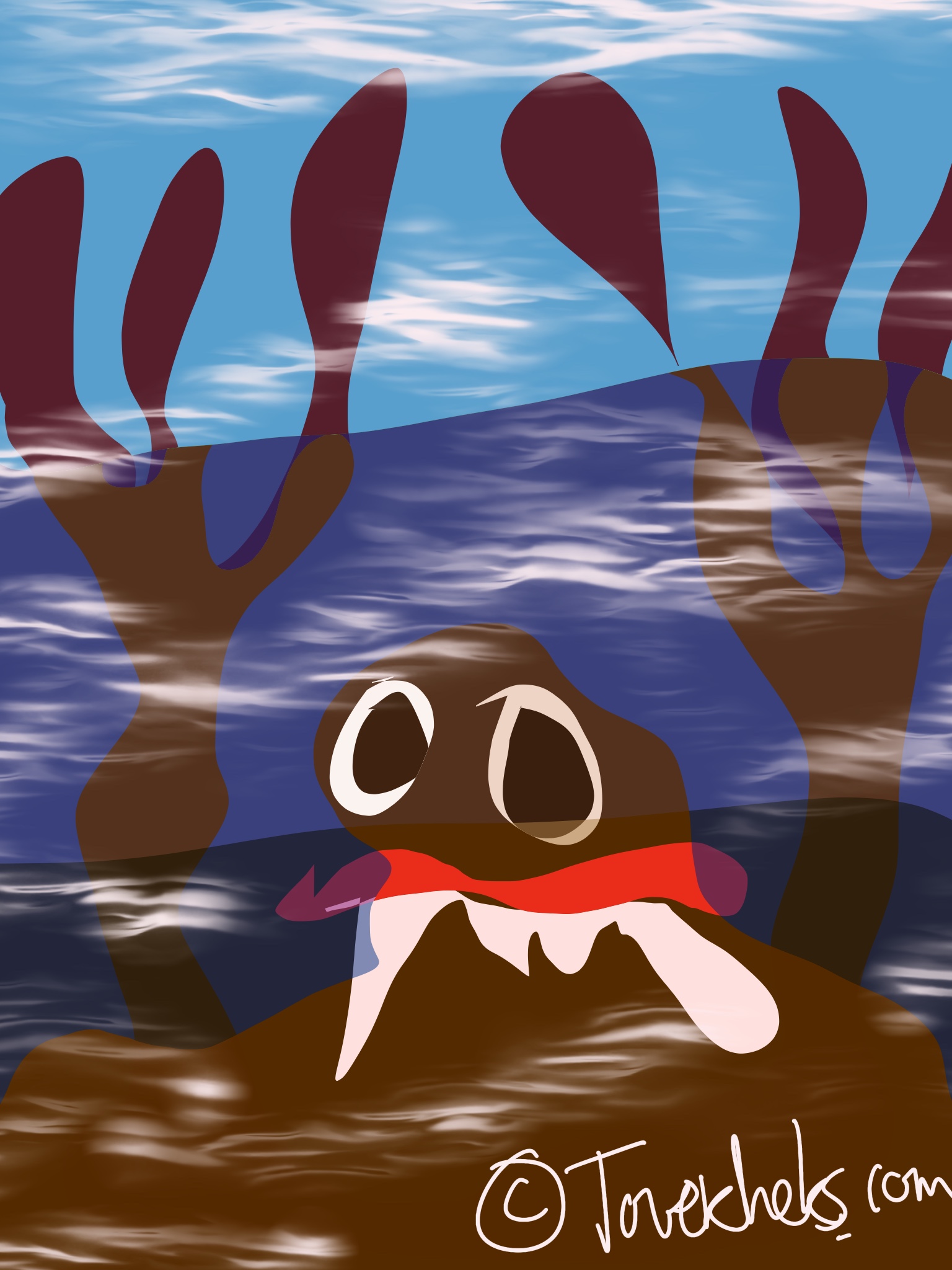Mijn hondje is tijdens een poging om zijn tennisballetje te pakken vast komen te zitten in de vegetatie aan de overkant. Om zijn poten zit een waterwief gewikkeld. Haar groene grijpgrage vingervlugge wikkelhanden winden zich in rap tempo om mijn schat. VikThor voelt het gevaar. Ik zie paniek in zijn ogen.