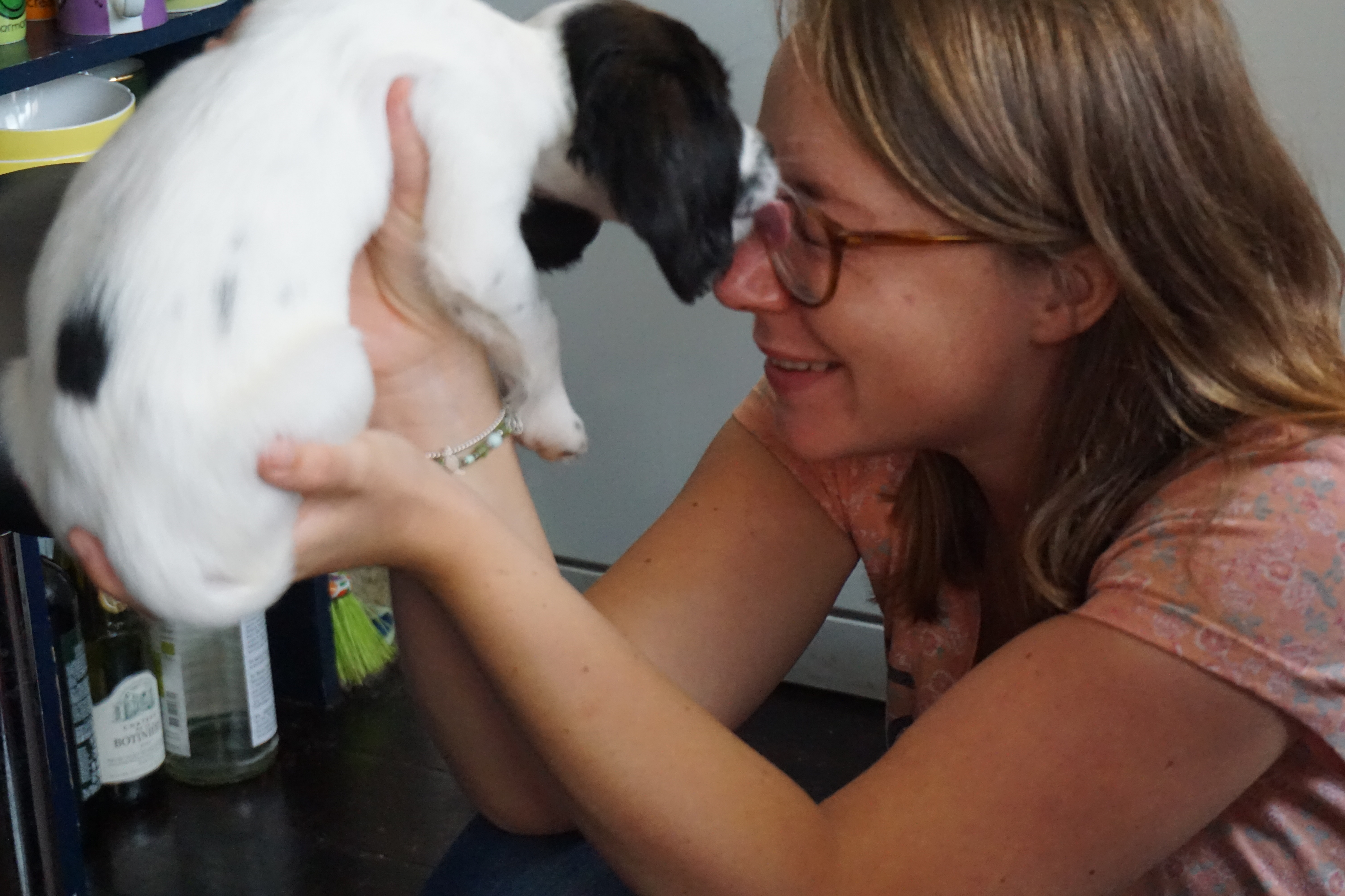 pup geeft kusje,puppy, springer spaniel, jonge hond, hondenbaby, piepklein hondje,