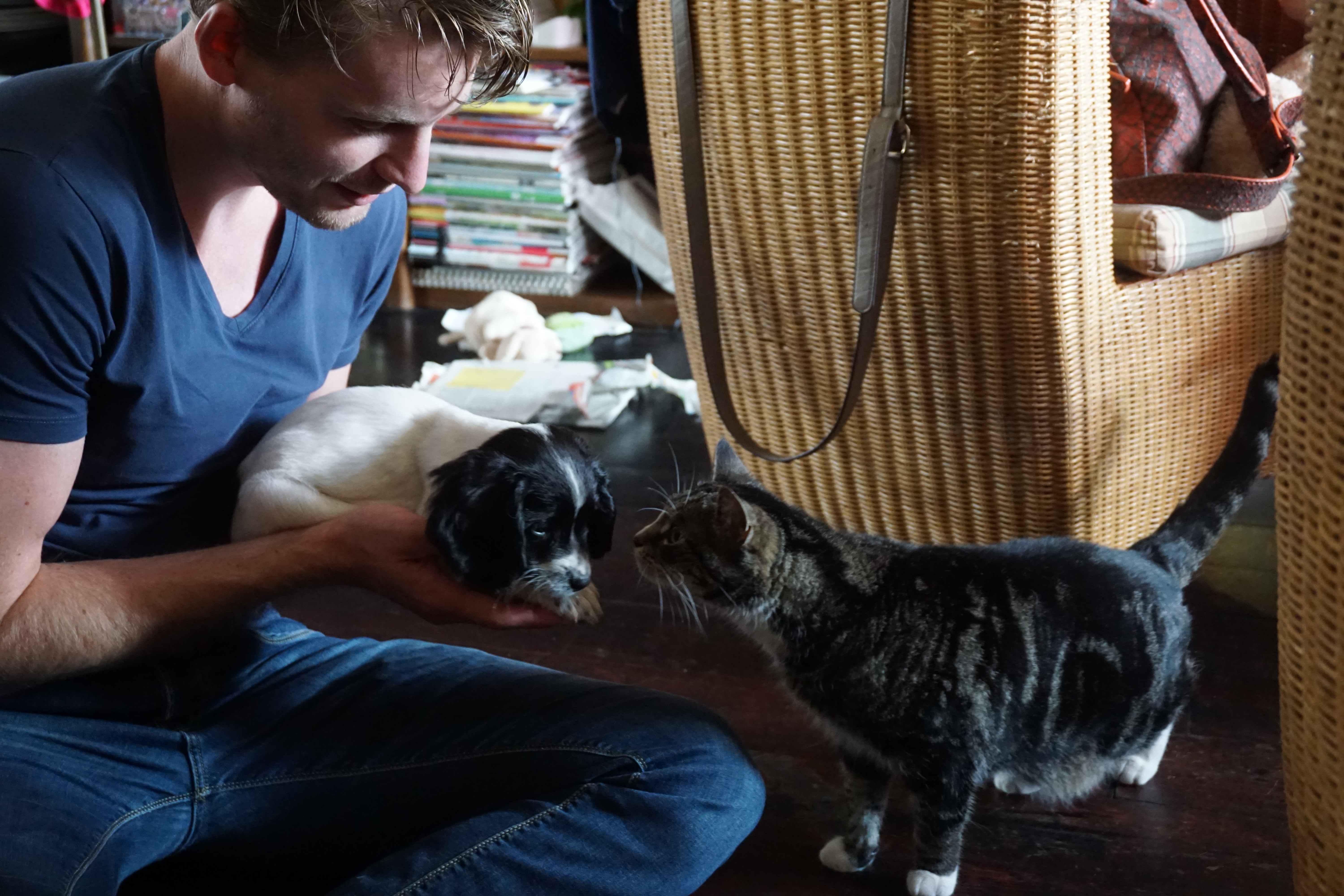 kat ruikt aan pup, puppy, springer spaniel, jonge hond, hondenbaby, piepklein hondje,