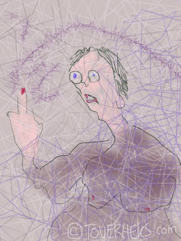 ‘Er staat hier een vrouw, die wil zo’n grote witte veer. Voor op haar hoed, ze heeft echt een hoed op! Ze wil em niet in haar reet, zei ze. Ja echt, dat zei ze,’ de man begint te giechelen, ‘Lachen joh, ze staat hier uitgebreid te poseren, haar vriendin maakt foto’s, echt waar, hahaha!’