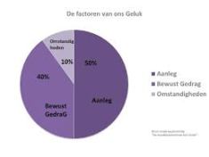 ‘Ja, hele lange zin. Hoe zat het ook alweer? Als je jullie geluksgevoel in stukken verdeelt, zoals bij een pizza of taart, dan staat bovenaan 50% aanleg. Dat is hoe je geboren bent. Optimist of pessimist… En dan dus dat hele kleine stukje van wat je overkomt, maar 10%. Waar je woont, hoe oud je bent, heb je veel vrienden of weinig….’
