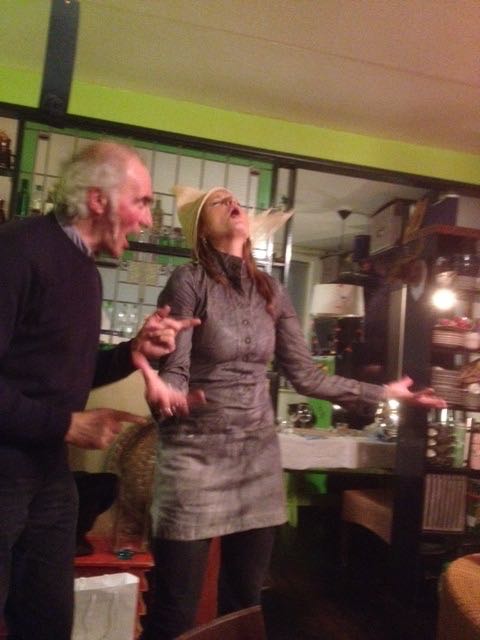 Aan het eind krijgt deze grote bescheiden man een staande ovatie. Het publiek staat als één man op. Prachtig. Wat een geweldige avond heeft hij ons bezorgd! Later in de foyer praten we met de directrice van het theater Liesbeth Huiberts. Zij en haar man directeur Kees van Leeuwen zijn de stuwende kracht achter dit initiatief. Frogs heeft natuurlijk ook met hen vroeger samengewerkt. Met Gruppo Tutto Dramatico en In Casa. En ook dat heeft Heks gezien!