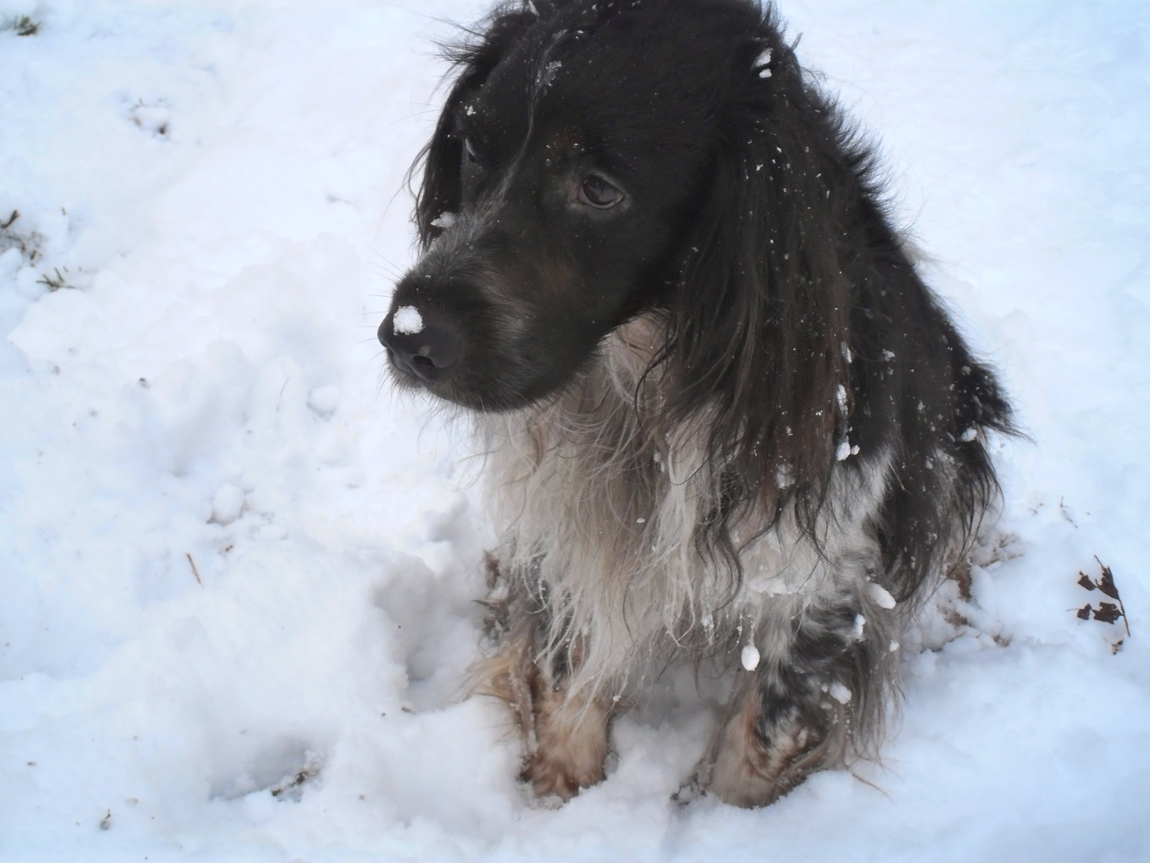 We lopen kriskras door Het Hout. Sneeuw dwarrelt om onze oren. Het is grauw en grijs in het schemerige bos. Ik kan mijn hondjes nauwelijks zien, perfect gecamoufleerd als ze zijn met hun witte vacht met zwarte stippen. Mijn Spingers zijn gewoonweg gemaakt voor dit soort condities!