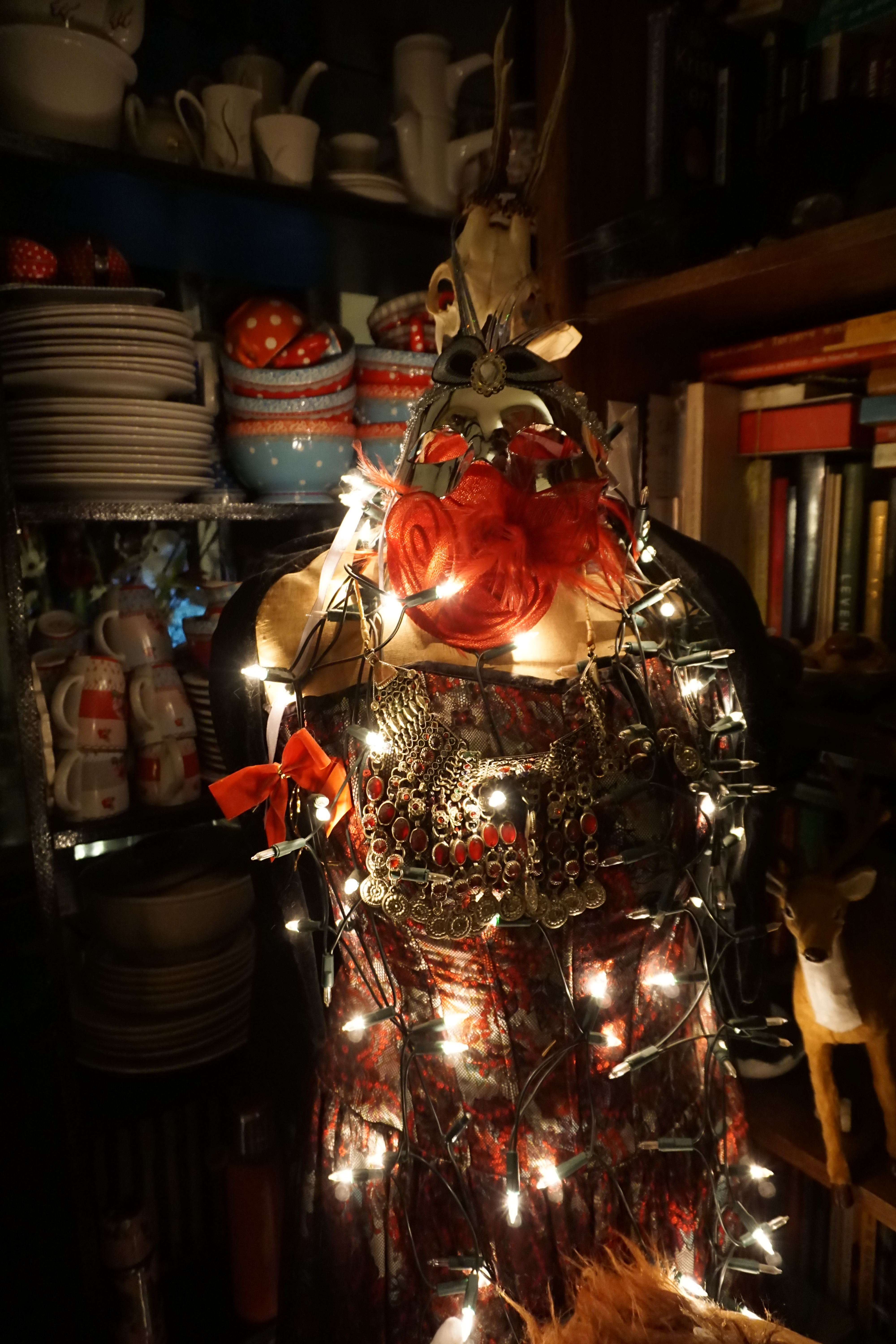 Dan gaat het langs Blonde Buurman. Met een superieur lekker wit wijntje en een bos kerstbloemen. ‘Ik blijf niet kletsen, hoor, anders wordt het veel te laat om nog ergens aan te bellen,’ duw ik mijn gaven in zijn verblufte gezicht. Verbaasd kijkt hij naar mijn kerstoutift. Rood puntmutsje, ijsberentrui, fout kerstvest vol sneeuwpoppen en kerstbomen, korte nepleren broek met daaronder een rode elfenpanty……