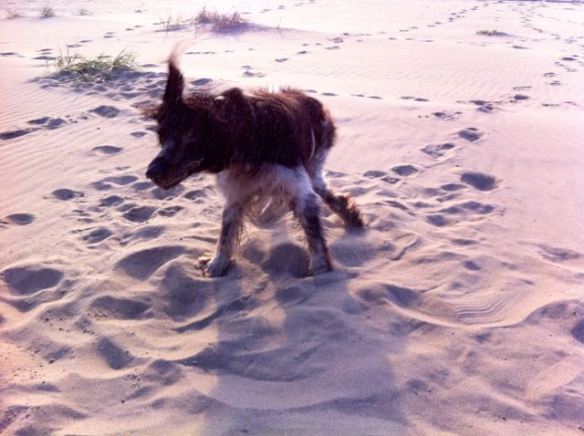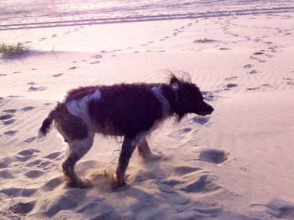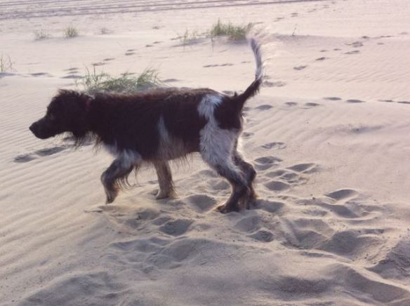 Af en toe spartelt hij een klein beetje. Als de handen gevoelige plekjes losmaken. Daarna een zucht en een grijns. Mijn hondje grijnslacht. Hij houdt ook van de Torenvrouwe.